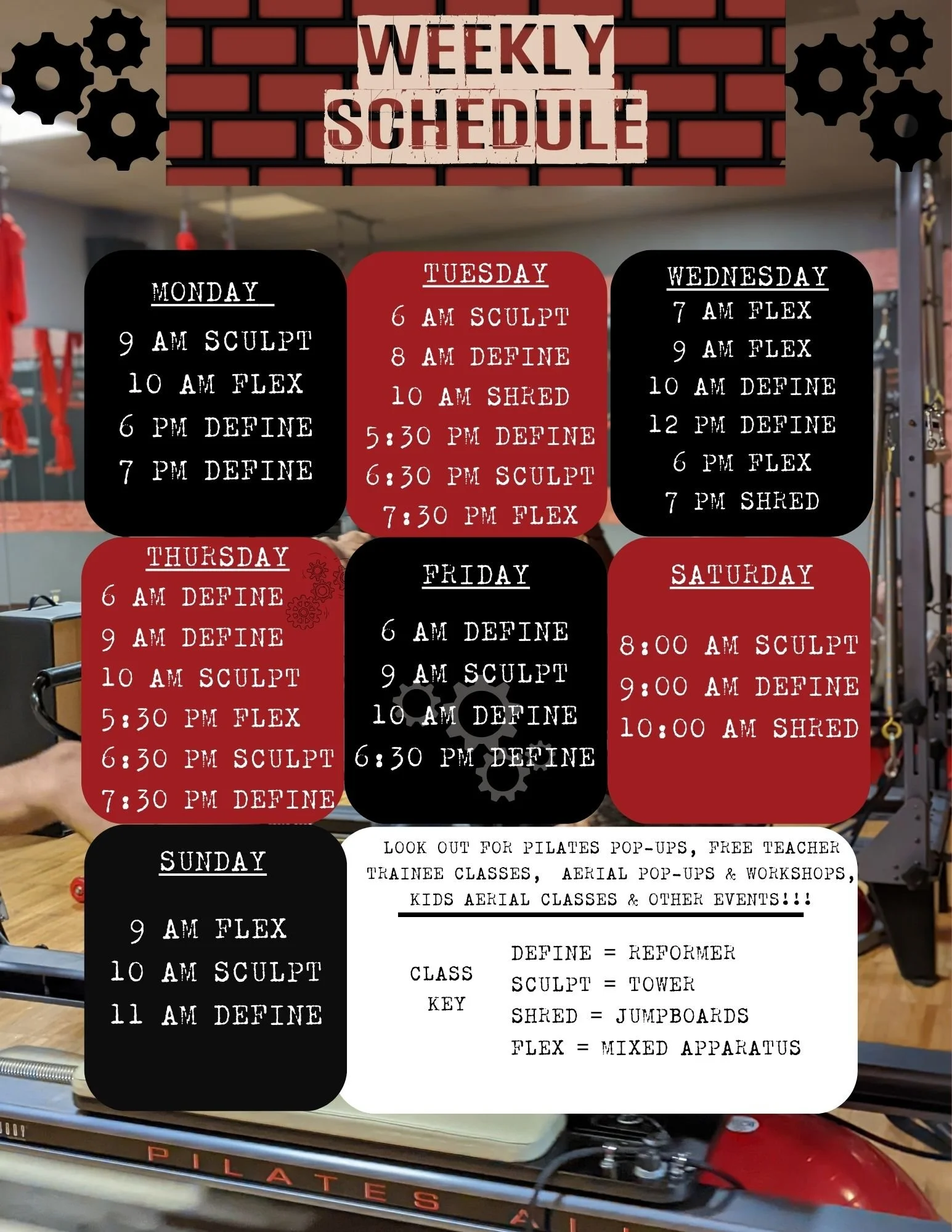 Schedule is subject to change. Please also note that for all classes if there is no one pre-registered 2 hours before class begins, class will be cancelled out. We do have an 8 hour cancellation policy, excluding extenuating circumstances.